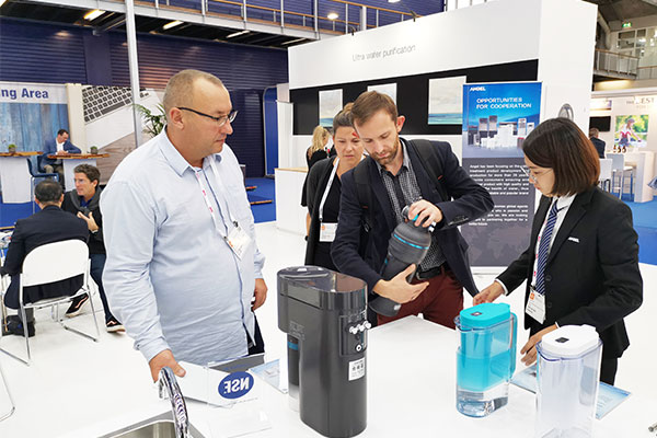 At Aquatech Amsterdam, Angel showcased the latest new products, solutions for purified drinking water, and innovative technologies. Angel A7 kitchen RO water purifier drew the most attention from visitors. Tactically installed under the kitchen sink, A7 functions for water supply in different quality with two faucets. Moreover, A7 incorporated a full-efficiency membrane independently developed by Angel, which perfectly solved the problems of traditional RO membranes in terms of low water flow, low rate of desalinization, and short service life.
